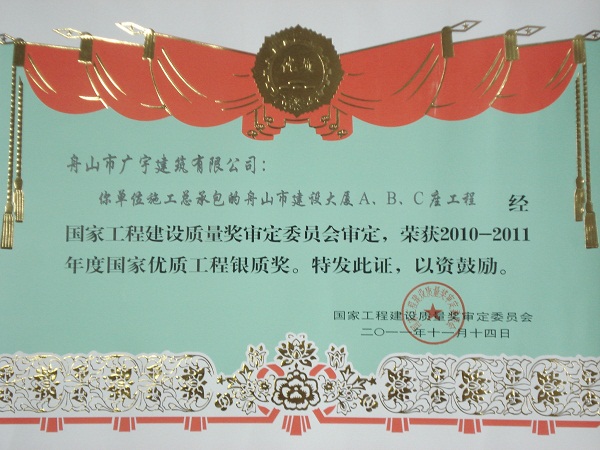 2010-2011年度國家優(yōu)質(zhì)工程獎銀質(zhì)獎(舟山建設(shè)大廈C座)